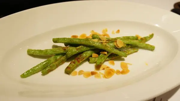 配菜:慢炸杏仁四季豆。上頭灑的粉味道蠻特別,四季豆鹹香涮嘴,跟鹹酥雞攤的有點類似,但口味精緻很多。