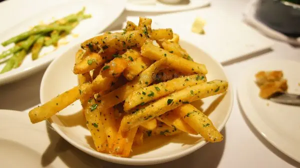 配菜:薯條。因為烤馬鈴薯沒了,所以換成薯條,薯條炸得很好,外酥內軟,油也瀝得相當乾淨,上頭灑上帕瑪森起士、巴西里葉,附上一小碟像是BBQ醬的醬汁。