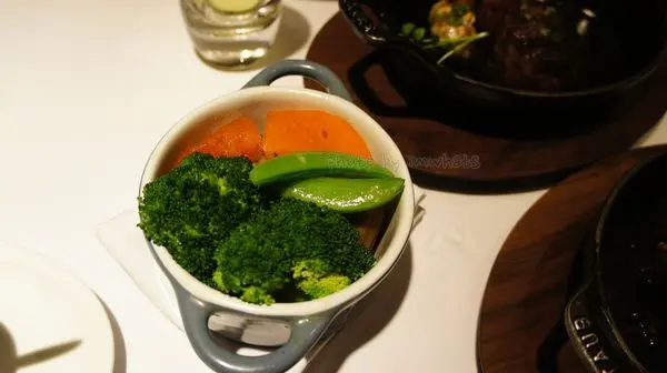 配菜:雞湯煨蔬菜。以根莖類為主的雞湯煨蔬菜,除了表面上看到的青花菜、甜豆、紅蘿蔔外,還有蓮藕、牛蒡和皎白筍,友人覺得有點像是高級版關東煮。我拿了友人不愛的蓮藕,蓮藕很清甜但染上了些許牛蒡味。