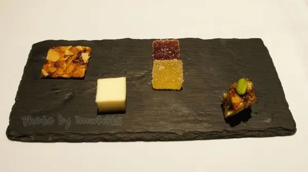 搭配茶或咖啡的法式點心,杏仁片、法式水果軟糖(真的很軟)、百香果棉花糖(?),照片上是兩人份。水果軟糖因為太軟了,拿的時候會心頭一驚,百香果那個很好吃,百香果味濃郁,酸酸甜甜非常討喜。其他兩款沒吃到就不多說了~