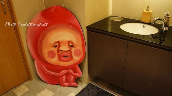 在介紹餐點前,先來看一下洗手間。由於中山店的空間較小,洗手間空間也相對被壓縮,除了屁桃可憐兮兮縮在牆角的立牌外,觸眼所及沒有其他的醜比頭相關物品。比較尷尬的是,這裡目前是男女同一空間,男生的小便斗就是在牆內弄出個空間,是個ㄇ字型,我是覺得如果有男生在上洗手間,然後我從背後經過好像有點害羞耶...