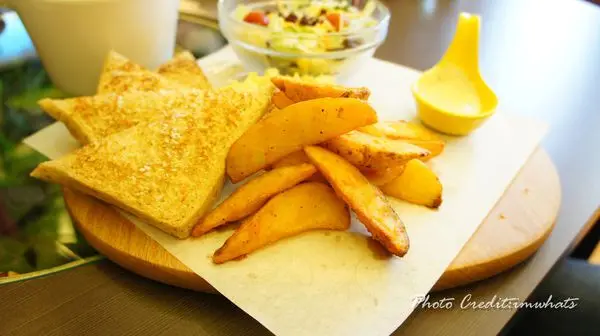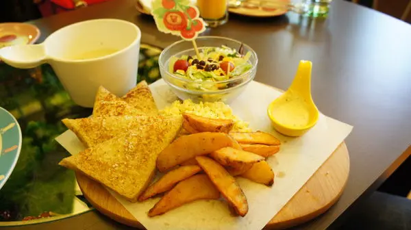 活力早午餐NT320,友人選的組合是:法式土司/酥皮臘腸/嫩蛋/脆薯/小沙拉(凱薩醬),另外加價30得到一杯每日例湯。這天的湯是玉米濃湯,還蠻大杯的,質地有點像是麥當勞的那種玉米湯,但味道比麥當勞好上許多,有點訝異這湯的味道比想像中好。