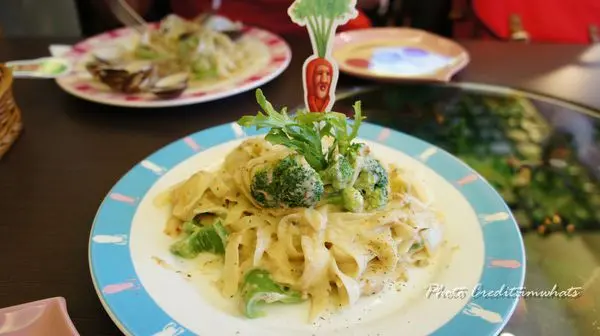 撇開這件事不談,我覺得這道麵食味道挺不錯的,雖然有兩根辣椒但其實不怎麼辣,微微的辣和奶油白醬很搭,降低膩口的感覺。鮮蔬有青椒、洋蔥、青花菜和玉米筍,雖然有我不吃的青椒和洋蔥,但還是不減我對這道麵食的肯定。對了,寬麵依然維持它軟爛的口感,如果店家能夠掌控好麵條的熟度會更好~