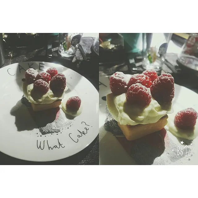 在九千剛開幕時初造訪,便愛上這裡的環境、食物和親切的人,就此成為常客,超過兩個星期沒報到就渾身不對勁。也因此幾乎吃遍小店所有菜單上有的(和沒有的)東西,而和人員們也變得熟稔。坐下後老闆聽說我隔天生日,沒多久就擺出了這個東西,說是祝福我的生日。這是老闆隨意以現有的材料做出來的小驚喜,我叫它「台式鳳梨酥佐新鮮覆盆子及特製香草卡士達醬」(大笑)