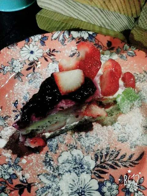 在費城起司奶酪蛋糕體中混合新鮮水果,因應不同時節,裡頭的水果有可能替換成芒果或草莓(個人比較愛好芒果),上方再舖上一層杏仁酥粒,替整體口感更加提升,這是常態商品中我永遠吃不膩的一道甜點。