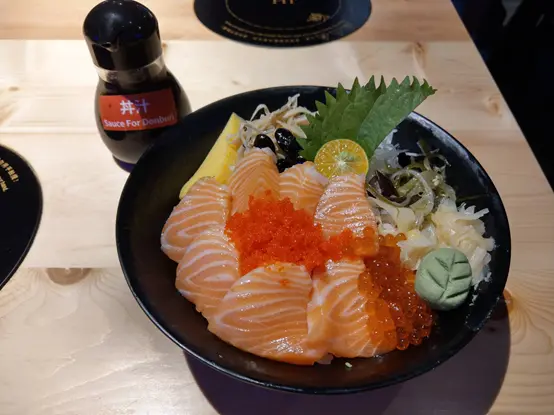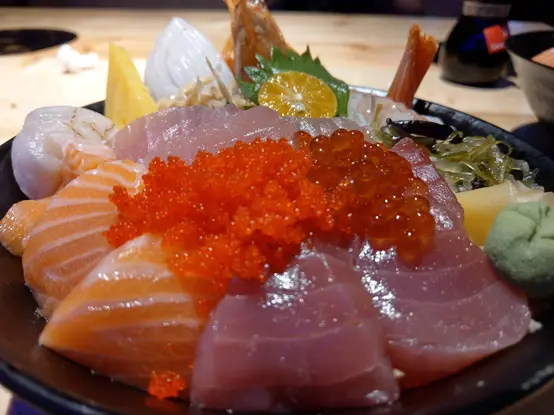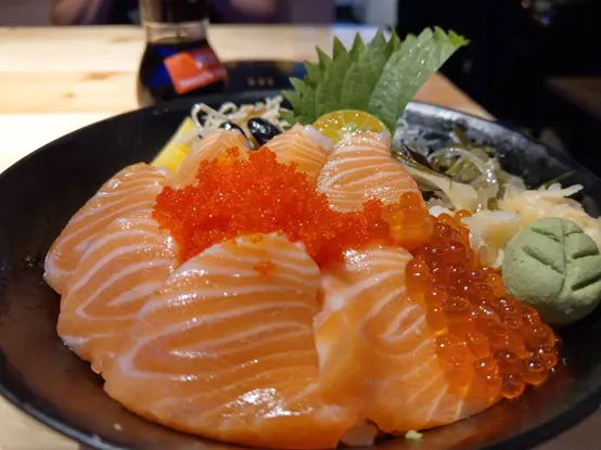 多片鮭魚搭配上蝦卵跟鮭魚卵一碗只要160!