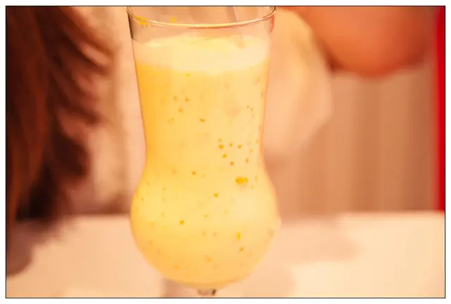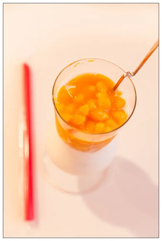 喝到快見底時,小賈努力地吸著芒果與西米露