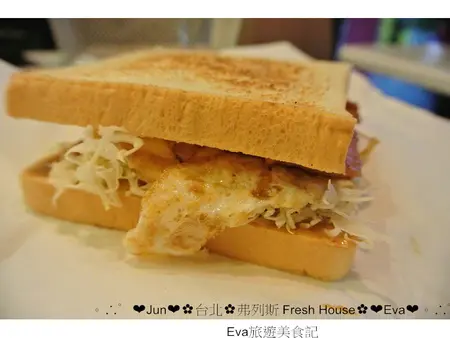 一切開後的三明治,可以聞到濃濃的花生醬,而且一口咬下,花生醬搭上起司、蛋、豬排,整個很合!