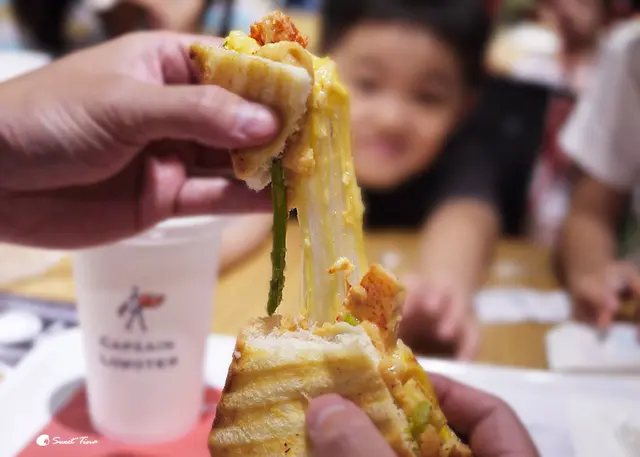 瞧瞧這個牽絲的樣子,就知起司量不少了,一旁的孩子看到也忍不住想分食,太誘人啦~