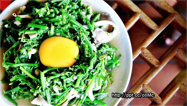 將蕨類野菜「過貓」快炒後,上面打一顆蛋有畫龍點睛的效果