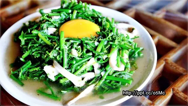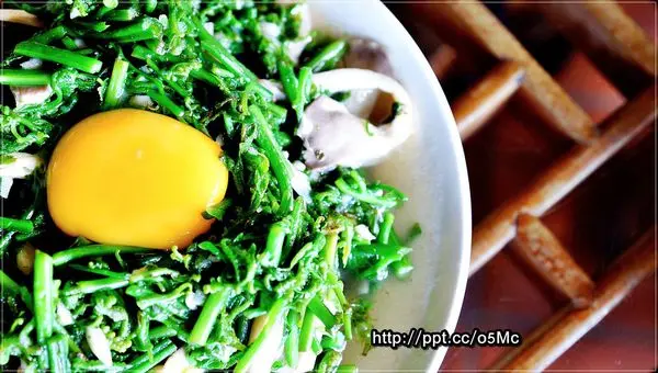 將蕨類野菜「過貓」快炒後,上面打一顆蛋有畫龍點睛的效果