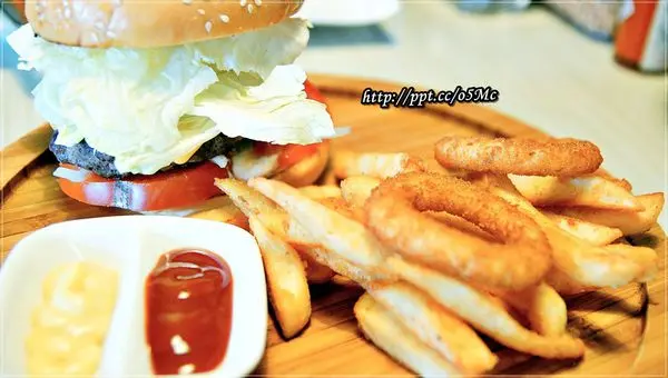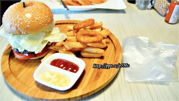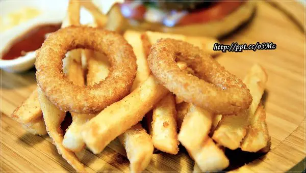 一旁還搭配洋蔥圈跟薯條,吃下來肚子都好撐了