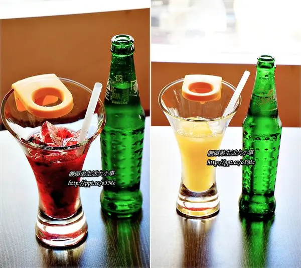 飲料的部分,我們點了覆盆子氣泡飲料(左)+柳橙氣泡飲料(右)