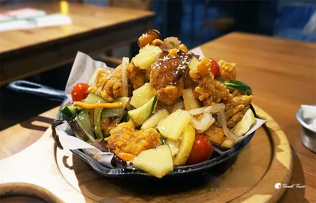 韓式水果糖醋無骨炸雞 - 採用了大量的水果及蔬菜一同搭配,和台灣的糖醋很不一樣,是很清爽的水果香氣,無骨炸雞拌著微酸微甜的醬汁一同品嚐就是對味,大推!