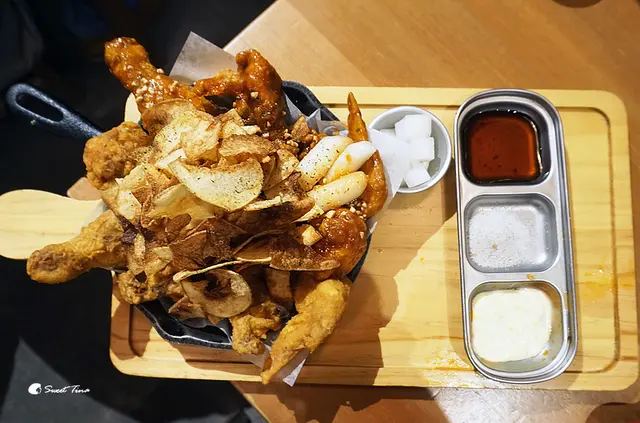 韓式醬+傳統炸雞各半 - 相當有份量的炸雞,四個大人分享都沒問題呢,一半是不裹醬的傳統炸雞,一半是裹醬的韓式炸雞,裡頭還附上了年糕及洋芋片,而傳統炸雞也可以搭配著右邊三種佐料,感受不同風味。
