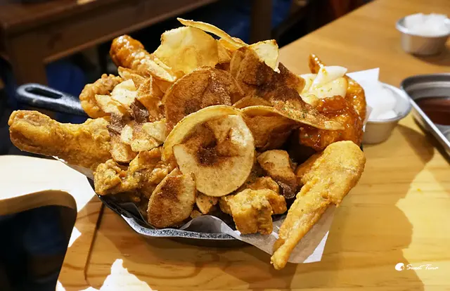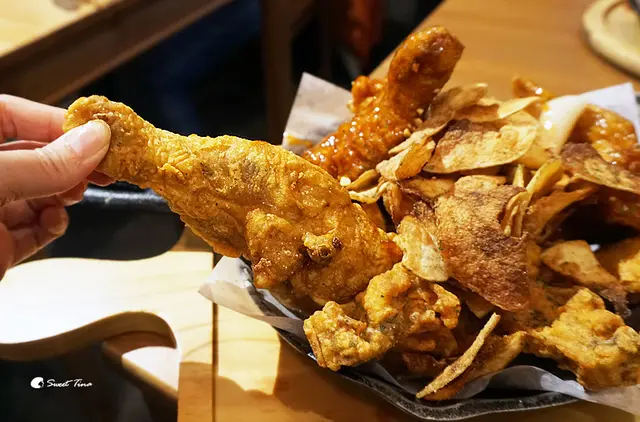 除了大口享受炸雞的美味外,這裡還要特別推薦上頭的洋芋片,這可是店家採用新鮮馬鈴薯製作的,略帶點厚度的口感,可以吃得出馬鈴薯本身的香氣,真的很棒耶,一定要品嚐看看。