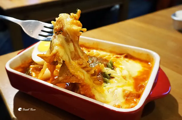 起司年糕 (微辣) - 辣年糕搭配豐厚的起司,上頭還有些許的麵條及半顆蛋,口感相當多層次。