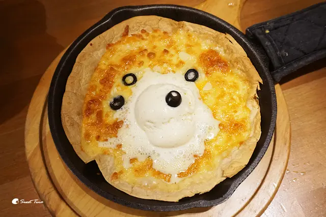 用湯匙吃的地瓜pizza - 薄皮地瓜pizza上頭還放了一球冰淇淋,以黑橄欖裝飾後,好像微笑的熊,超可愛的。