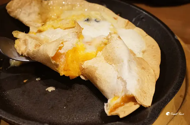 看似薄薄的一層,但裡頭很有料,有豐厚的起司搭和地瓜泥,果然要用湯匙大口挖。
