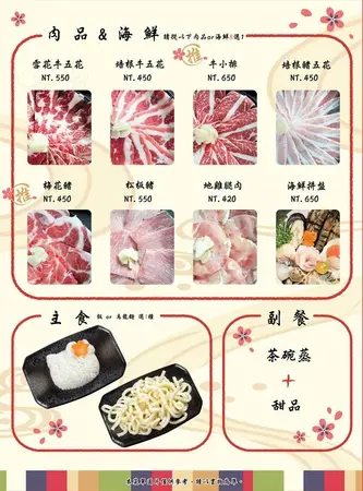 450元包括了,一鍋湯底(可選兩種口味)、肉品(雞、豬、牛)、主食(麵、飯)、副餐(茶碗蒸+冰品)、菜盤!