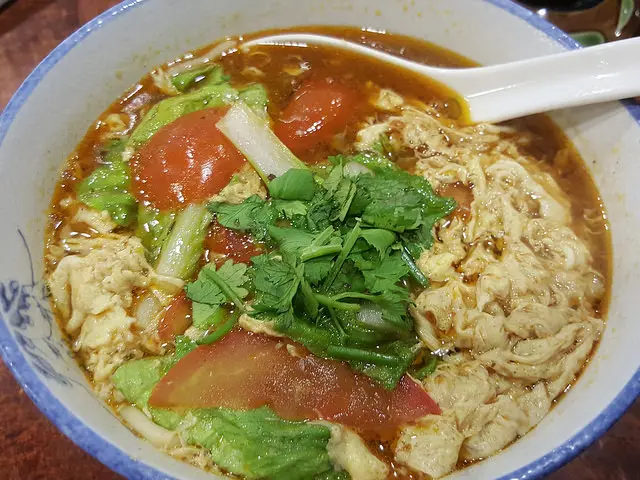 基本的牛肉湯底加上麵條、番茄、小白菜、蛋花,最後在放上香菜,這樣的組合非常適合不愛吃肉又愛湯頭有肉味的朋友們享用