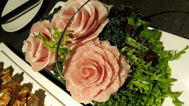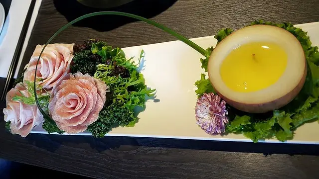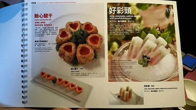 黃瓜搭配鴨賞及米酒浸至幾分鐘,鑲崁穿搭入半透明的多汁蘿蔔裡,鮮紅翠綠仍在,顏色甚美,口味是清爽的甜,是一個大腦記憶沒有接觸過的味道層次,清新地,一點都不輸給王公貴族的奢華料理