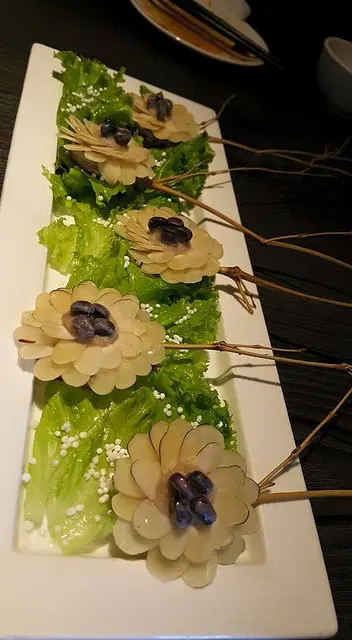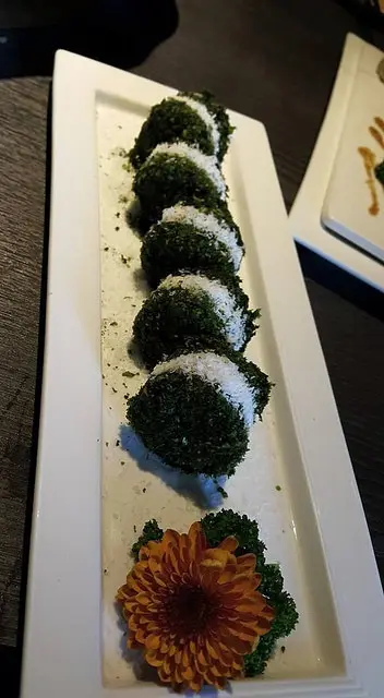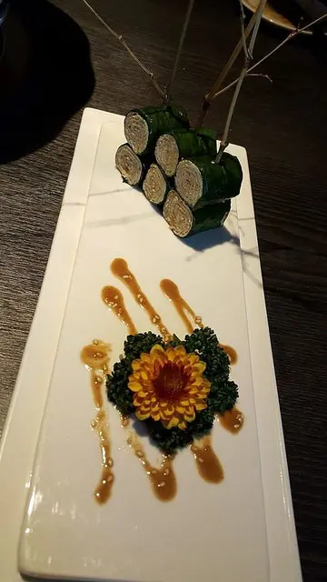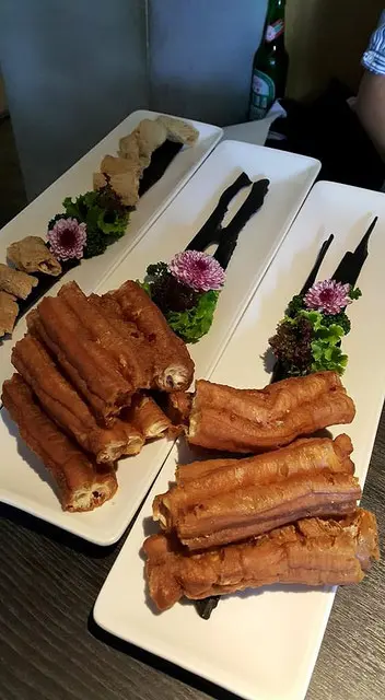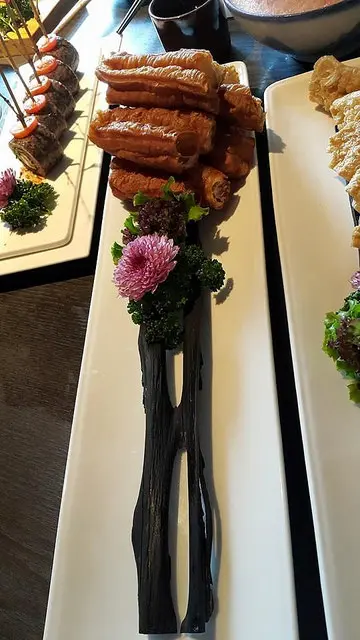 嚴選新鮮豆皮與養身白芝麻,白芝麻顆粒與打研磨芝麻醬,以新鮮菠菜層層包裹,汆燙後,白芝麻香氣濃郁,芬芳四溢,越咬越香,以燙過的高山菠菜葉捲起塗滿胡麻醬的豆皮,涮煮之後入口,有著濃郁豆香與芝麻味,只容於口不容於手