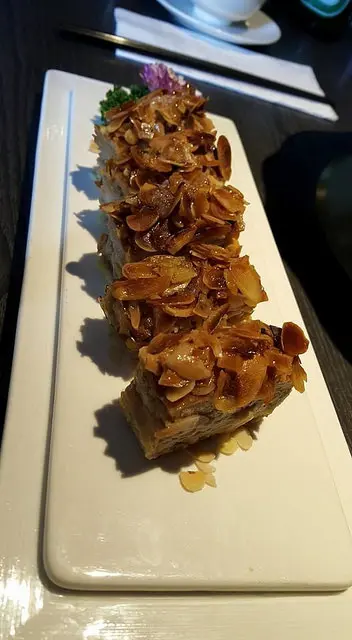 煙燻豆皮加上蝦的鮮兒味,在嘴裡纖纖的漸次擴散,把鮮蝦提得極為清爽,將蛋汁微烤至金黃,鑲貼上香酥杏仁片,映著白底層從暈染,宛如水彩墨