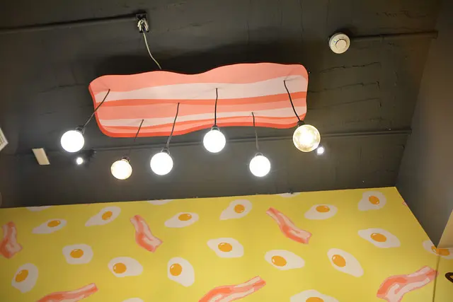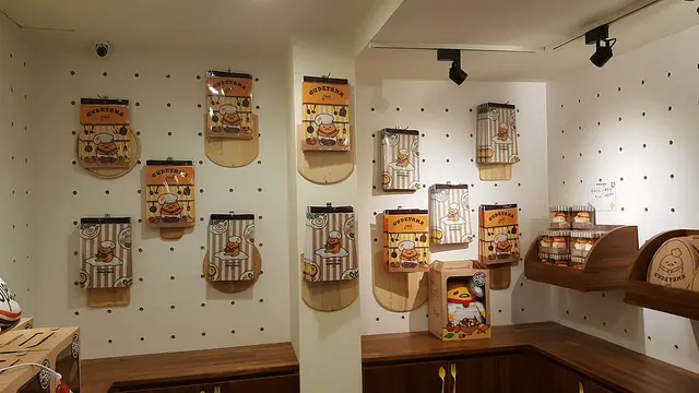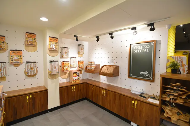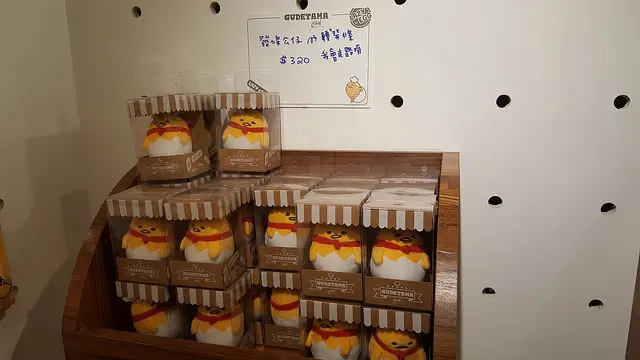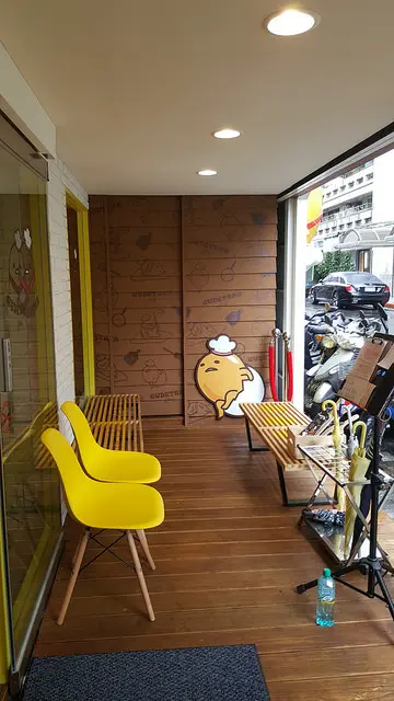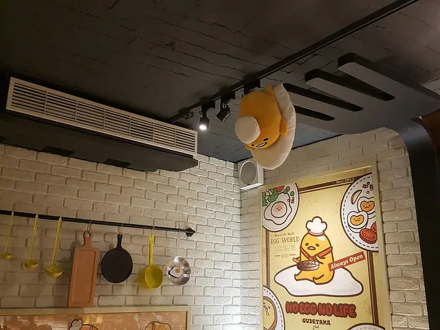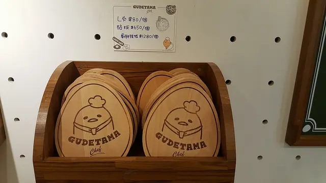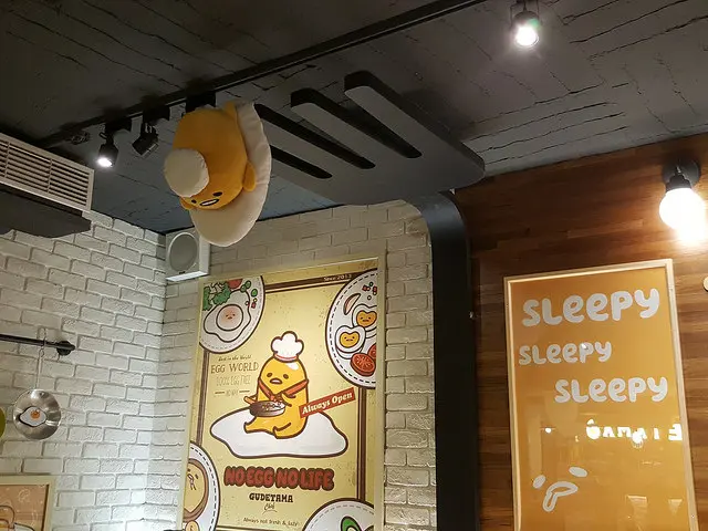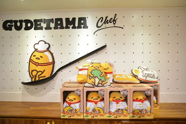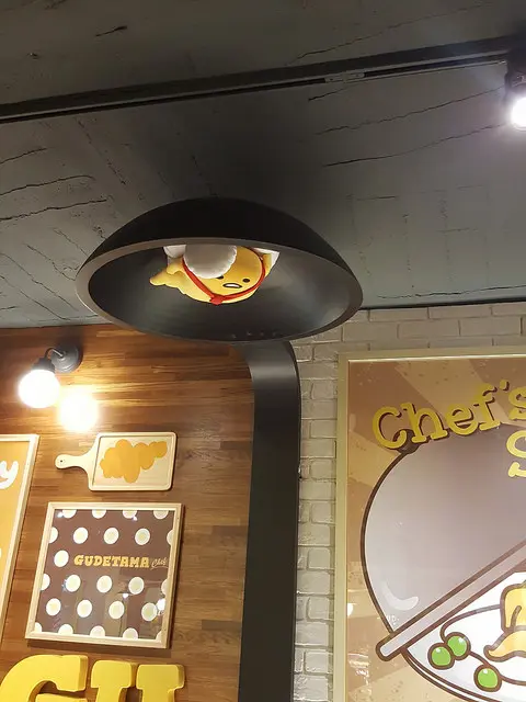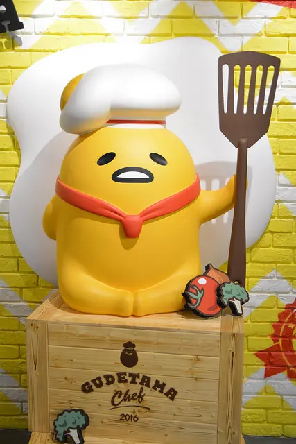 ▲在外觀裝潢上除了有吊在牆壁上非常醒目的蛋黃哥之外,玻璃展示櫥窗中,還展示蛋黃哥的廚師衣服和廚房道具