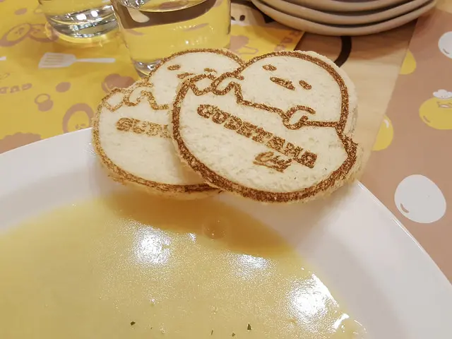 玉米濃湯上還附上兩片可愛的烤蛋黃哥吐司,濃湯的表現就相當的普通