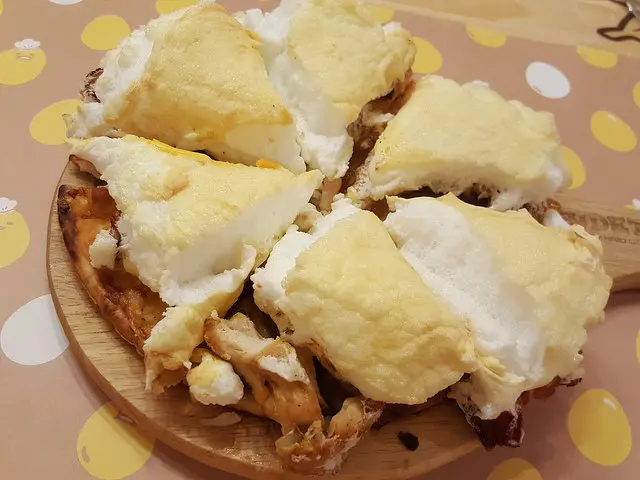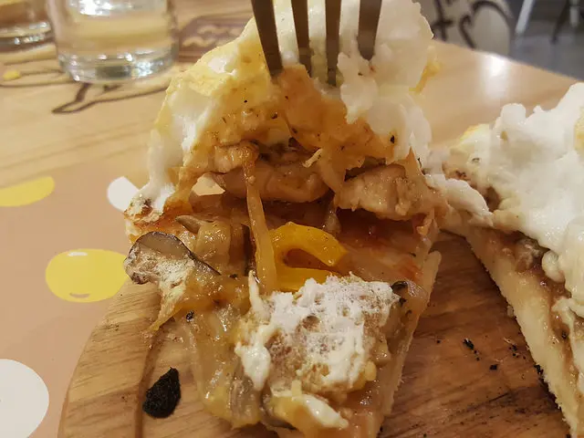 ▲雲朵山賊雞披薩,上面是打發的蛋白霜,本身沒甚麼味道,口感相當蓬鬆稍微帶點彈性,但入口後沒幾秒又宛如泡沫般在嘴裡慢慢化掉,底部所使用的是較薄的披薩皮,口感稍微偏硬相似於餅乾,披薩皮上所使用的醬料為日式山賊醬(早期日本廣島、山口縣一帶,山中盜賊會將肉品用鹽、黑胡椒與大蒜等佐料醃漬保存,這種豪爽的黑胡椒醬調味方式,被稱為「山賊醬」_並加入雞肉、甜椒、洋蔥...等時蔬。