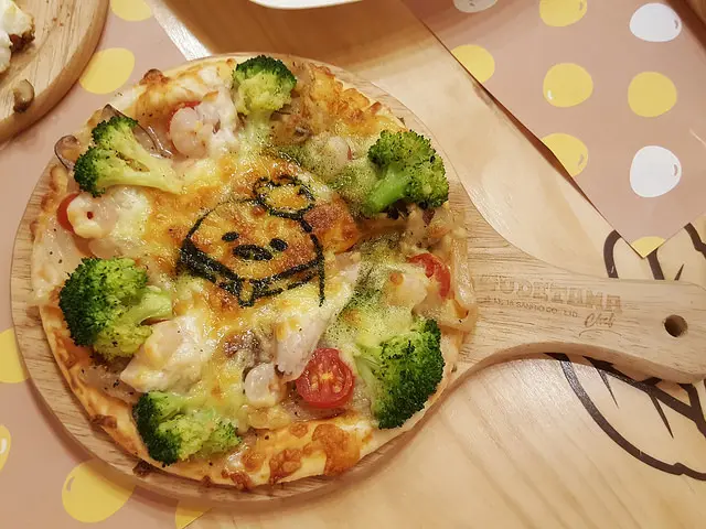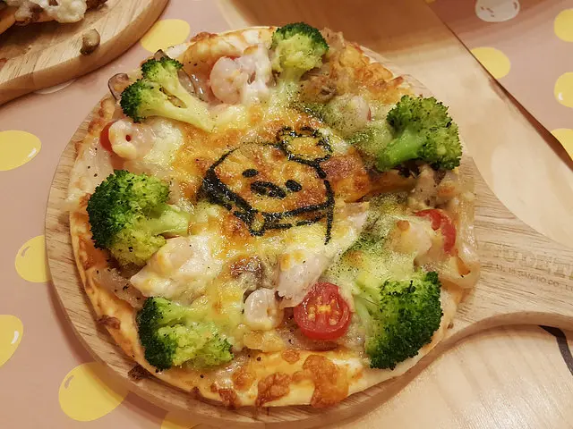 所使用的配料有蝦子、花枝、花椰菜、番茄、洋蔥加上牽絲的起司,底層的餅皮一樣是使用口感偏酥硬的薄皮披薩,整體口味偏淡,甚至可說接近原味