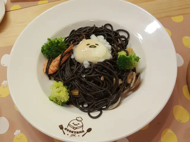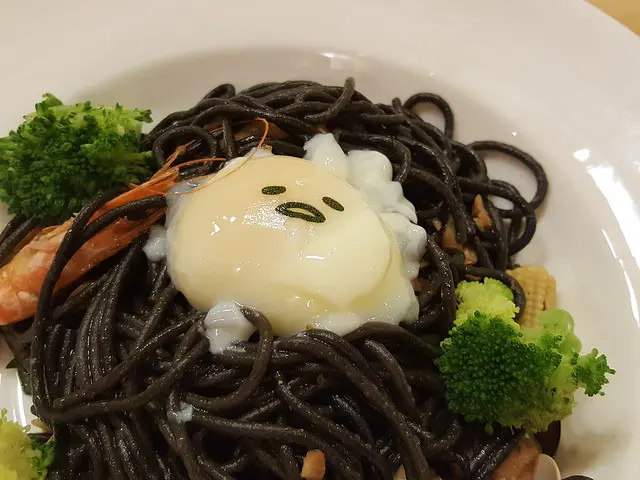 溫泉蛋上使用的是糯米紙點綴眼睛、嘴巴的模樣,使用的配料有蝦子、魚片、玉米筍、蛤犡、花椰菜,麵條上的醬汁有一種類似美極鮮味露的味道,溫泉蛋拌入麵條後,整體風味就稍嫌偏淡了些。