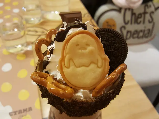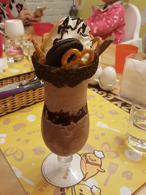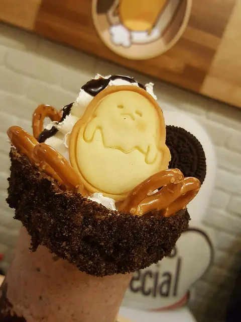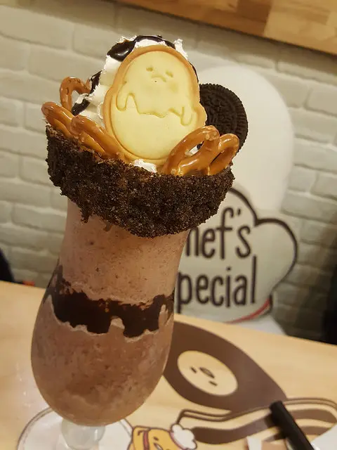 巧克力冰沙上擠上一坨鮮奶油,再加上蛋黃哥造型冰乾、蝴蝶餅乾、巧克力、巧克力夾心餅乾。