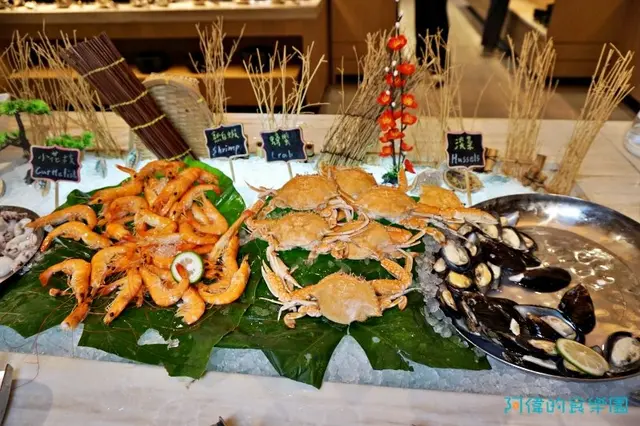 燙熟的海鮮區,有白蝦、螃蟹、淡菜等。