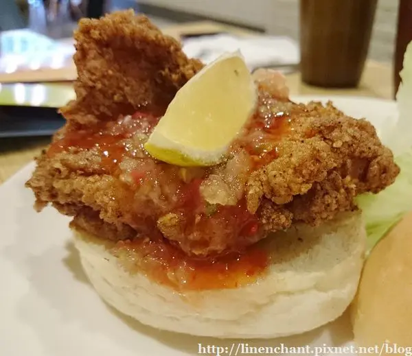 一整塊的炸雞還蠻大的,都比漢堡還要大哩~~~~面已經淋了泰式醬汁,還附了一塊檸檬讓你擠在上頭~~~只能說份量算是很實在的漢堡啦!!!!!!!
