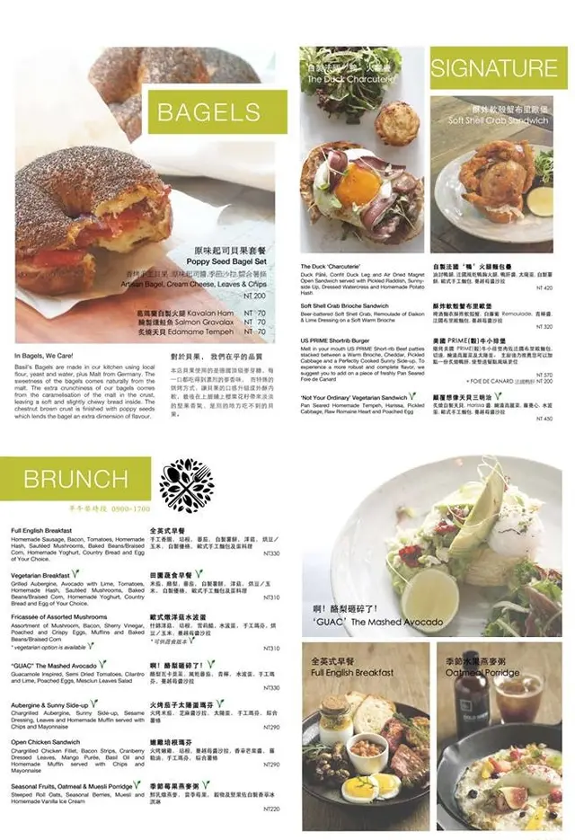 有全英式早午餐、太陽蛋瑪芬、莓果燕麥粥、淡菜薯條、松露薯條、爐烤春雞、牛小排堡、油封鴨腿、牛排等等