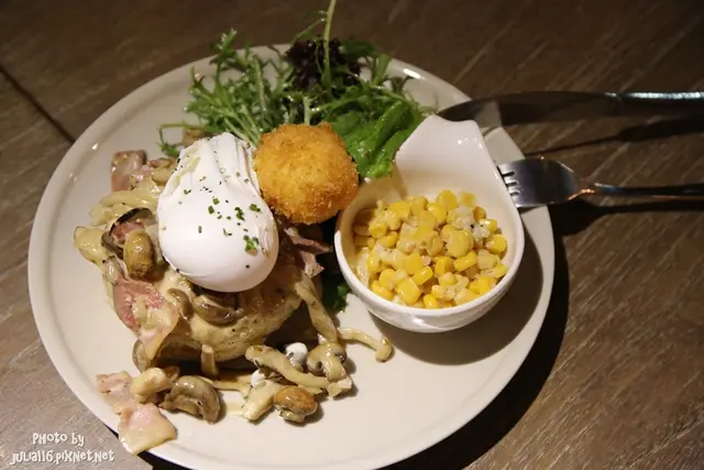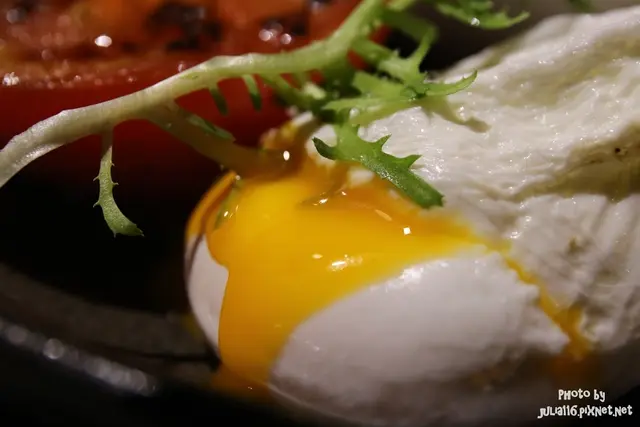 我輕輕將叉子搓破水波蛋,看著金黃色蛋液緩緩流出........然後竟然就忘了拿湯匙去接