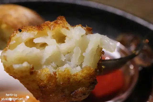 ▼一旁干貝大小的薯餅竟包入了一絲絲洋蔥,咀嚼時不僅有洋芋香,也多了洋蔥的甜,口感與味道都令人驚喜^^