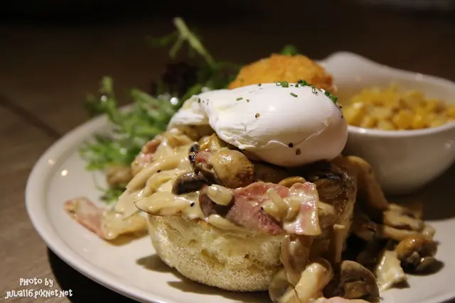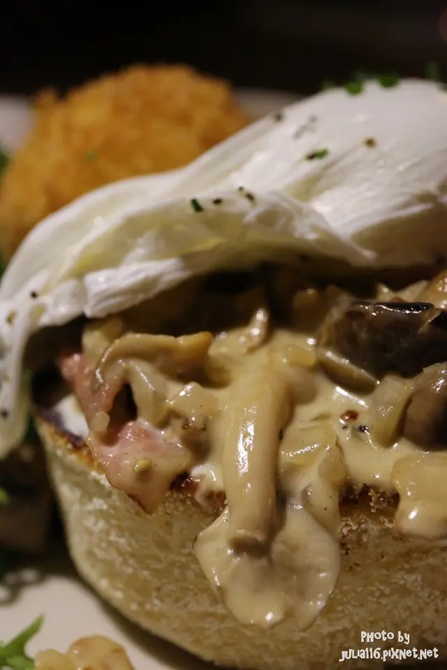 ▼半熟蛋汁伴著鬆軟的瑪芬與炒洋菇,超乎水準的美味啊