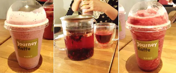 由左而右分別是:香蕉野莓奶昔、黃金歲月水果茶 和 蘋果野莓冰沙↴