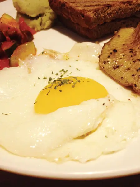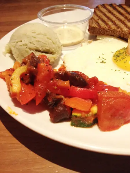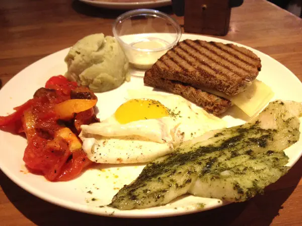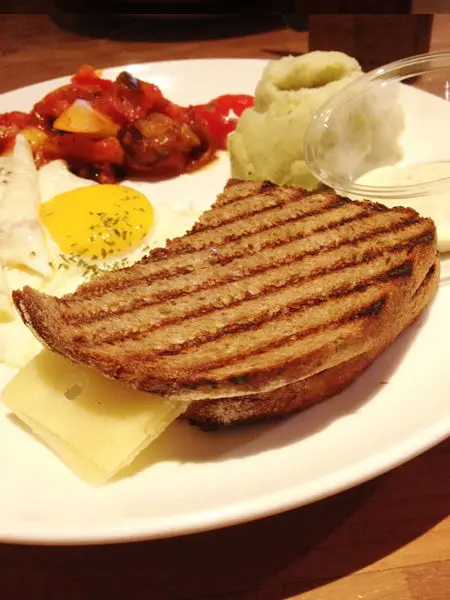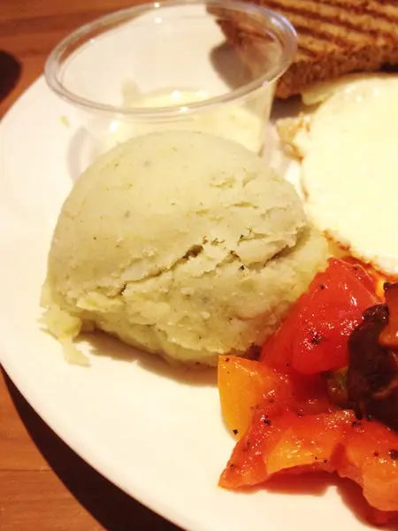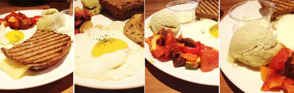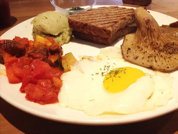 內容物有:鮑魚菇+地中海燴菜+馬鈴薯泥+太陽蛋+羅勒醬+黑裸麥麵包