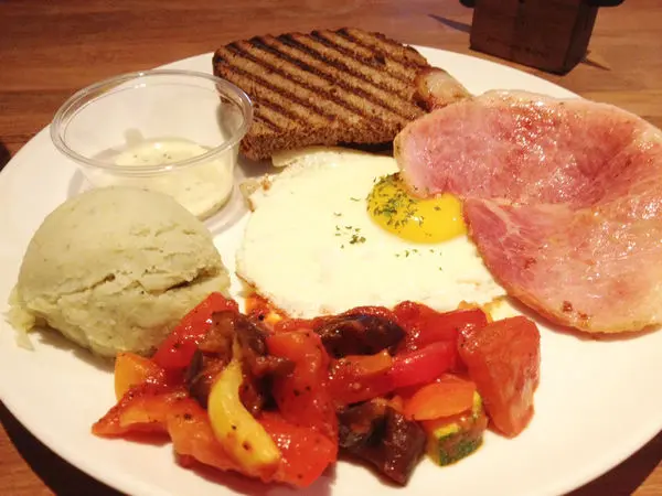內容物有:原片火腿+地中海燴菜+馬鈴薯泥+太陽蛋+蜂蜜芥末醬+黑裸麥麵包