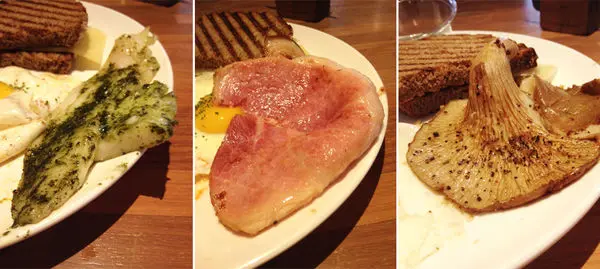 分別是迷迭香煎鮑魚菇、香煎原片火腿 和 香草烤魴魚