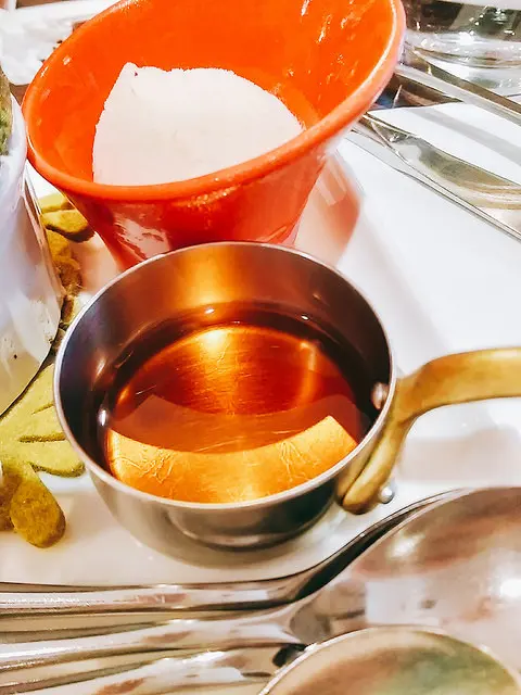 一旁搭配的是焦糖海鹽醬、葡萄柚雪酪