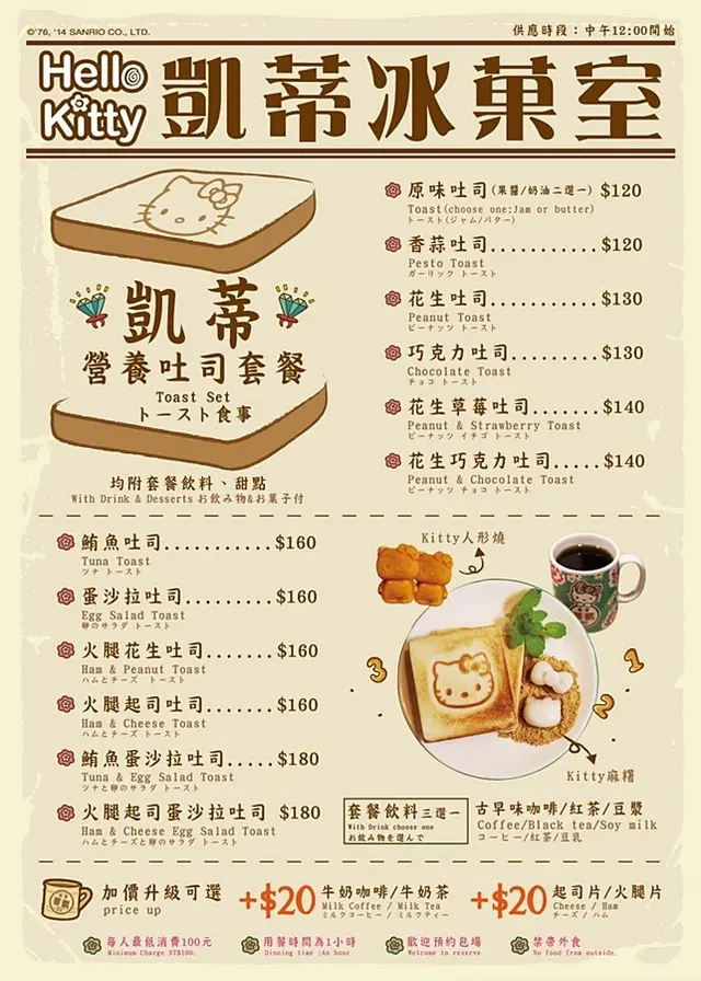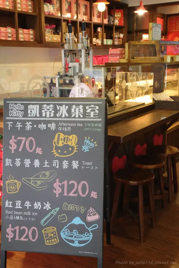 入口處的黑板上寫著下午茶、咖啡,還有凱蒂營養土司套餐?紅豆牛奶冰?