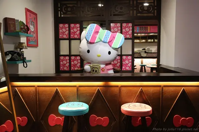 在店門口迎接大家的是有著大大蝴蝶結、穿著台灣道地紅白拖的正港台灣Kitty,稱為『寶島凱蒂』