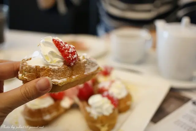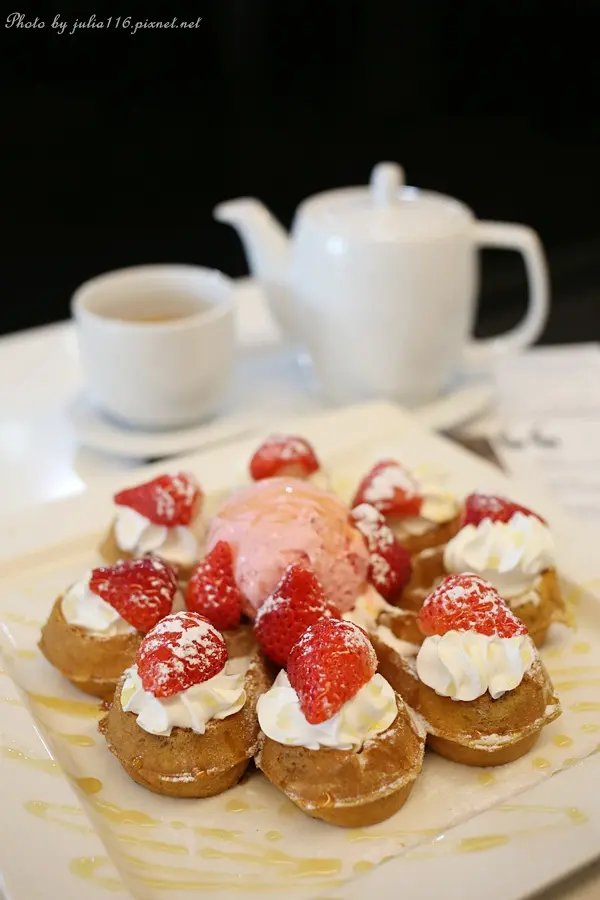 花瓣型鬆餅上頭淋了蜂蜜與店家自製鮮奶油,最後放上嬌豔欲滴的新鮮草莓