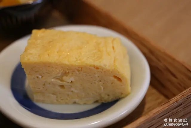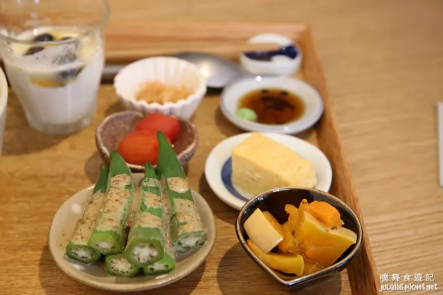定食配菜依季節不定期更換,這次有油漬日本干貝、白酒漬番茄、玉子燒、秋葵、地瓜、水果優格,另附白飯一碗
