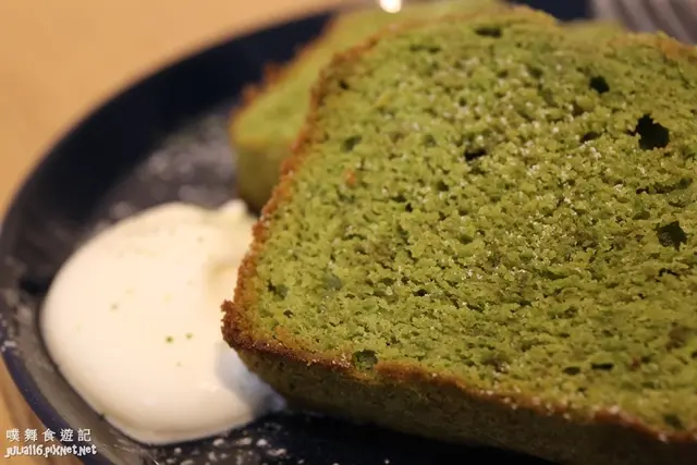 加熱過的抹茶磅蛋糕外層帶著如波蘿麵包般的酥香,吃在嘴裡卻不會乾口,抹茶香濃郁